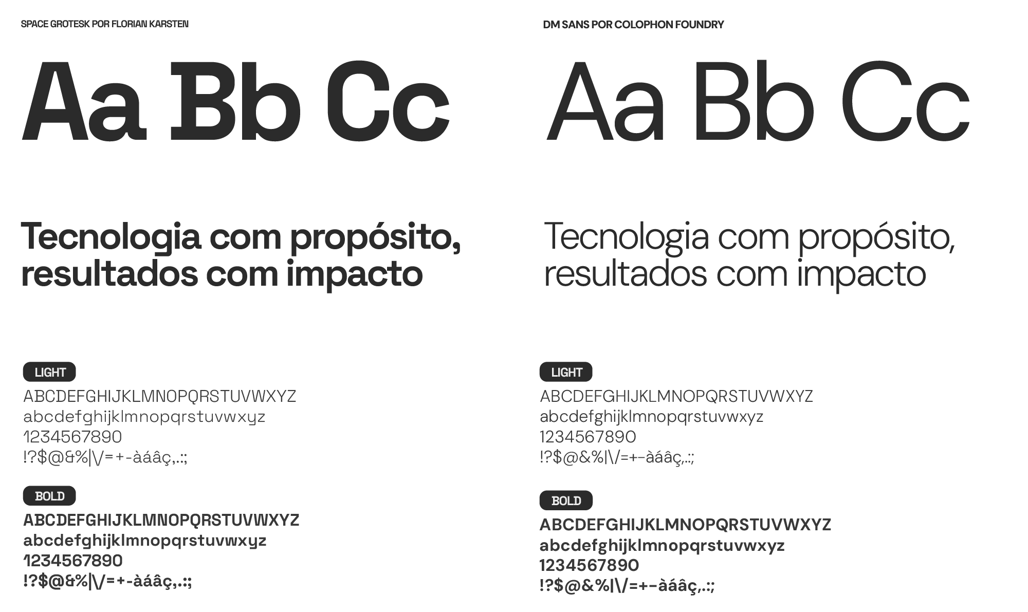 Ao mesmo tempo, o conjunto tipográfico reforça a maturidade técnica da marca, sem abrir mão da acessibilidade e da harmonia visual.