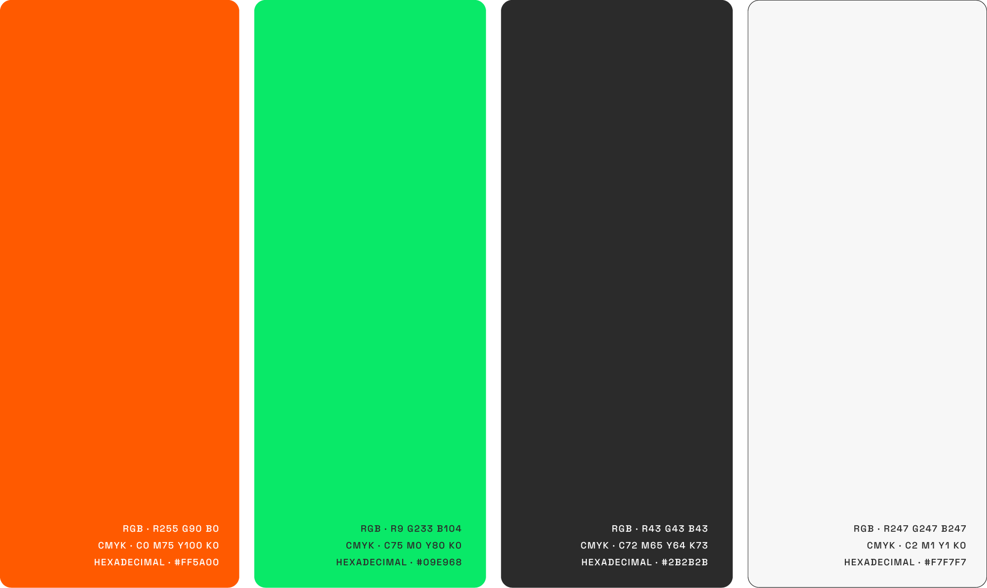 Como apoio, o cinza escuro adiciona sofisticação e profissionalismo, enquanto o cinza claro oferece clareza e respiro visual, equilibrando a vibração das cores principais com uma base sólida e neutra.