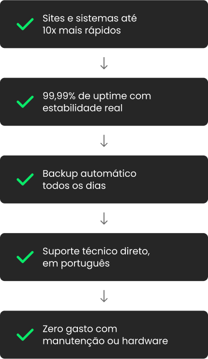 Storage NVMe com até 10x mais velocidade que servidores comuns. Seus sistemas rodam como deveriam.