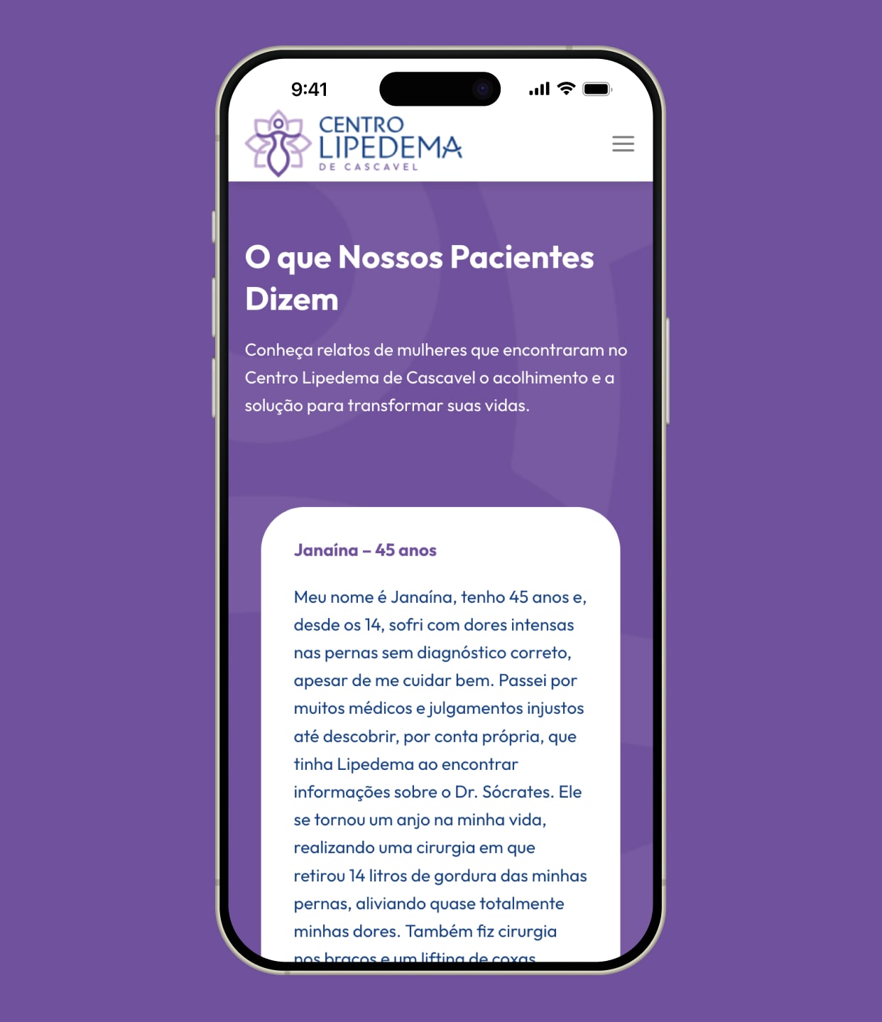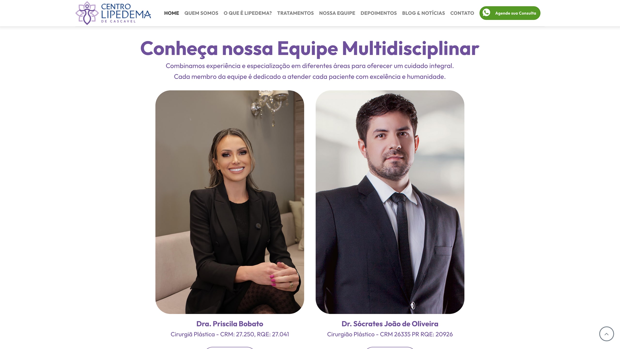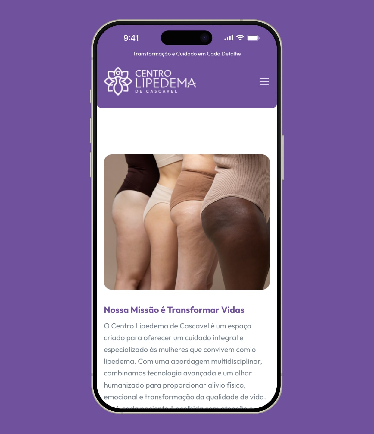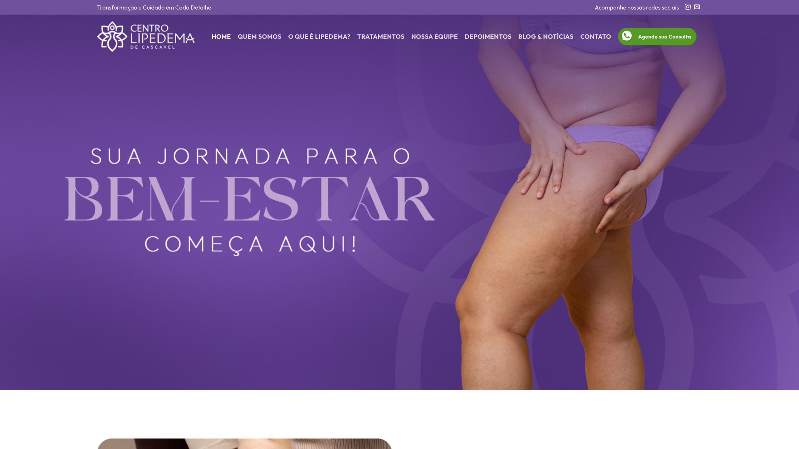 Desde as cores até o tom do conteúdo, todo o visual do site foi criado para conversar com mulheres que convivem com o lipedema, reforçando a credibilidade e o cuidado especializado do centro.