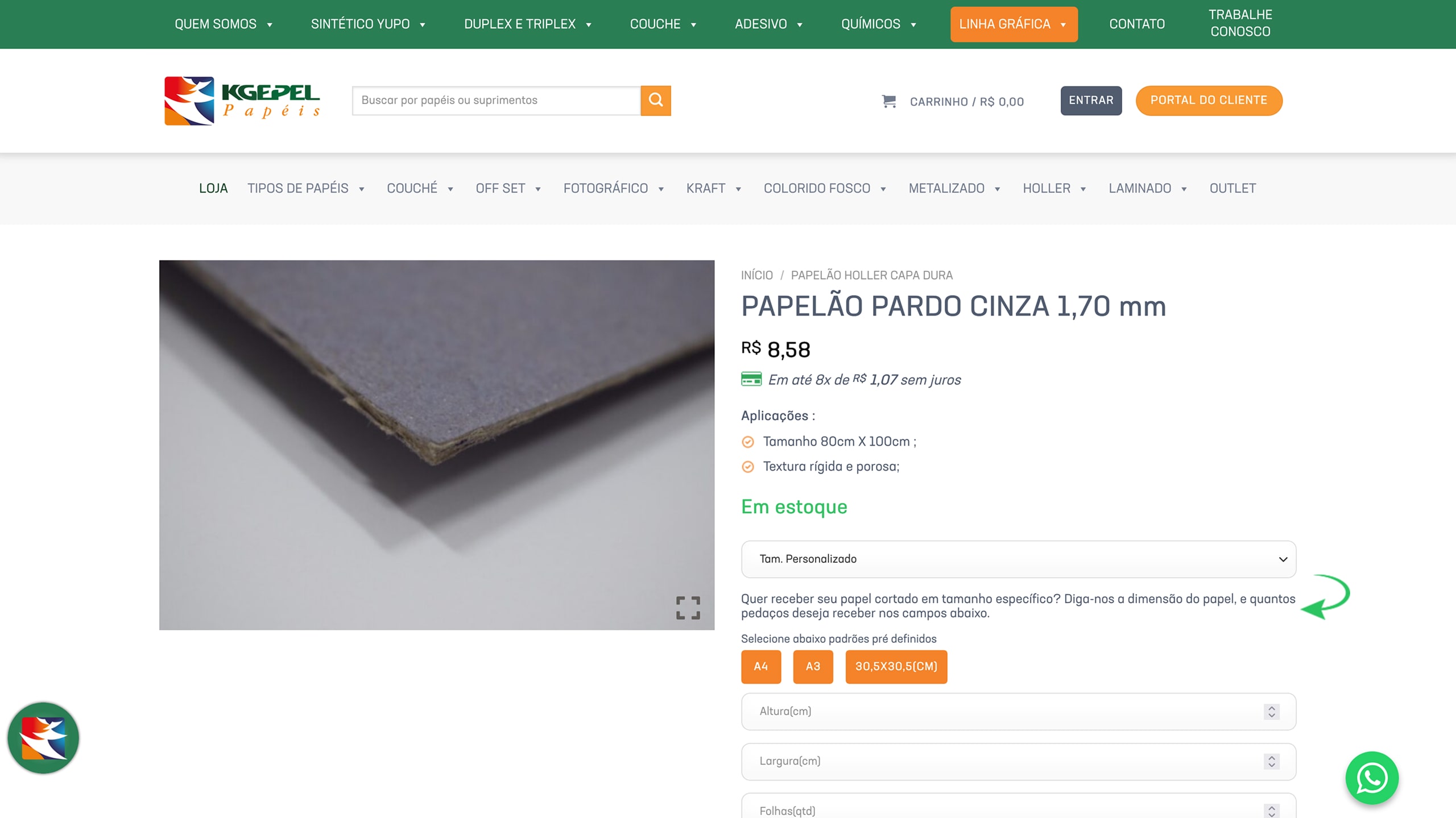 Desenvolvemos uma funcionalidade exclusiva que permite ao cliente selecionar formatos de corte sob medida diretamente na loja virtual, tornando o processo mais prático, visual e totalmente integrado à realidade do negócio.